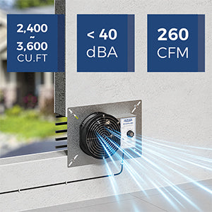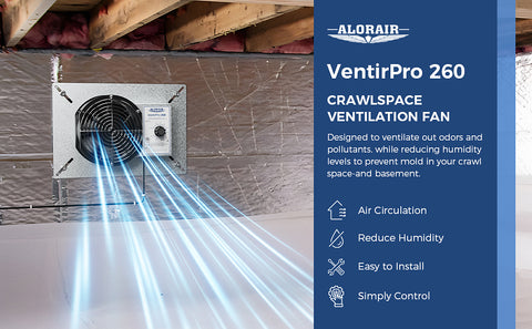 VentirPro 260 uses a 6.7-inch aerofoil fan, generating 260 CFM flow, to provide more efficient ventilation, and cover space up to 3600 cu. ft. Assists you in controlling the temperature and humidity levels of your space, making your crawlspace safe and comfortable, ideal for the basement, attic, garage and any space where air circulation is required.
